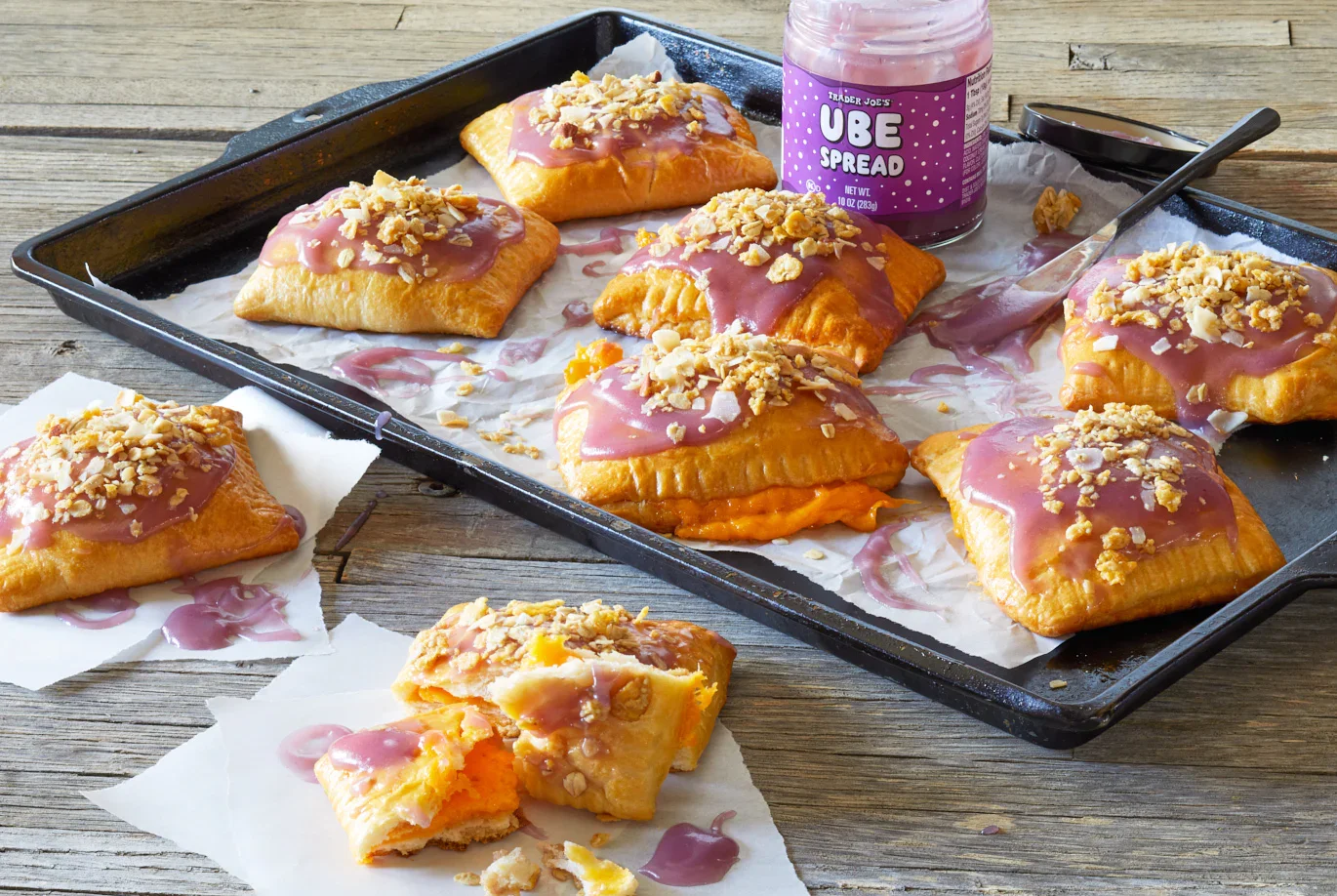 Trader Joe’s raves about Ube: “Our Ube Spread boasts ube purée as its first ingredient, which means it goes big on the distinct, craveable, coconut-meets-pistachio Ube flavor. Butter, cream, and coconut cream gives it its smooth, buttery texture; cane sugar sweetens the deal; and sea salt brings out even more of the Spread’s yummy, yammy flavor.